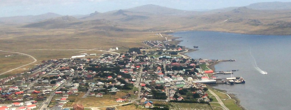 My previous blog ended with a rough sea sail from Ushuaia (End of the World) to the Falkland Islands, which is an archipelago about 300 miles from the coast of southern Argentinian Patagonia.  The population of this large group of small islands was 3,662 in 2021; most residents live in Stanley, where we landed in a tender (large, covered lifeboat) from our cruise ship.  Later we learned that the only trees on the island are those nurtured by residents in the city.  The following picture shows only half of the city.