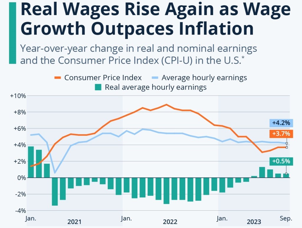 True, stubborn inflation has been a drag on consumer optimism since 2021. Median inflation estimates, however, declined for the one, three and five year time frames according to the December 2023 Survey of Consumer Expectations by the Federal Reserve Bank of New York. Consumer sentiment showed a positive gain of 15% between December 2022 and December 2023, according to the Economic Index of personal finance website WalletHub. And a Center for American Progress chart shows that 57% of U.S. workers have received raises that exceeded inflation.